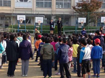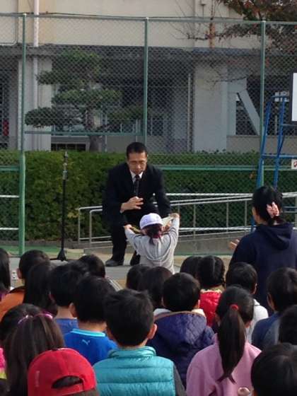 週明けで、朝にいつも通りに運動場で児童集会がありました。2年生が夏の絵のコンクールで入賞して、その表彰がありました。そのあと、今日から1週間の教育実習生の紹介がありました。
