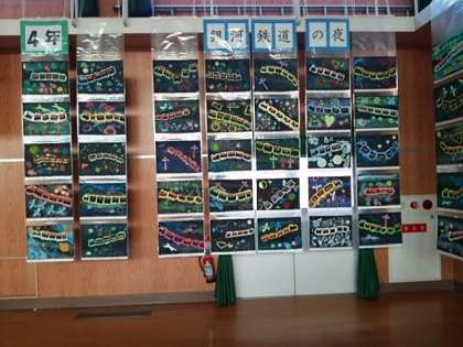 「銀河鉄道の夜」をもとにした作品です。ステンシルとスパッタリングの技法を使って表現します。