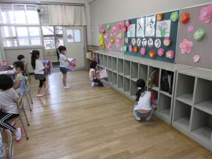 今日は初めてランドセルを背負って登校する児童が多く、小学校生活の第一歩を踏み出したように感じました。先生のお話をよく聞いて、これから6年間、登校したら最初にすることになる、「ランドセルをロッカーに入れる」ことを練習しました。とてもきれいに入っています!6年間大事に使ってくださいね!
