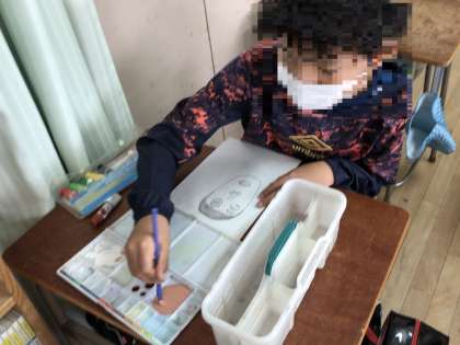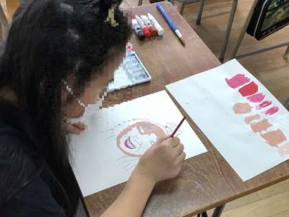 色を塗る時には、2つ以上の色を混ぜて、色の比率を変えたり、水の量を調節したりしながらオリジナルの色を作りました。