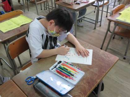 3年生は「はこの形」を復習しました。立方体を見ながら頂点・辺・面の数を数えたり、定規を使って展開図を書いたりしました。最後は実際に組み立ててサイコロを作りました。