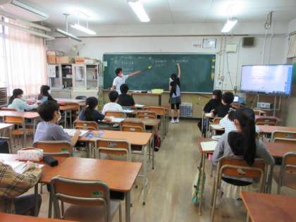 これまで取り組んできた群読やグループでの話し合い活動がまだできない状況ですが、先生の範読を聞いたり、前に出て黒板に答えを書いたりしていました。