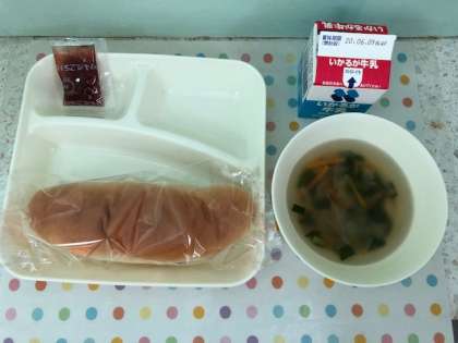 今日の献立は、ハムと野菜の中華スープ・大型コッペパン・いちごジャム・牛乳です。