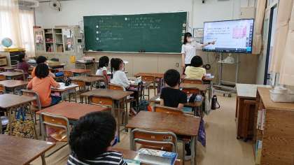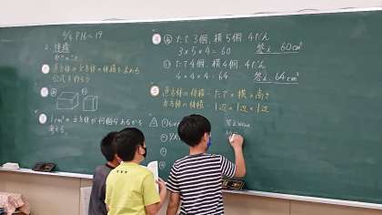 5年生は体積の学習をしました。立体を見て、1辺1cmの立方体が1段で何個あるのか、それが上に何段積み上げられているかで体積を求め、そこから公式を導いていました。公式を暗記することは大切ですが、ただ暗記するだけではなく、「なぜそうなるのか」を考えたら学習はさらに楽しくなると思います。とてもよい学習時間を過ごしていました。