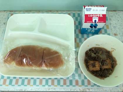 今日の給食は、すき焼き煮・おさつパン・牛乳です。