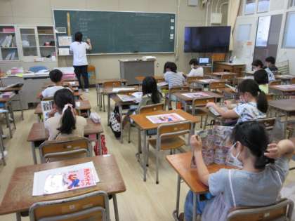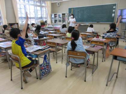 今日は教科書を広げて、なにがあるかのかを探しました。校区にはないものがたくさんありましたが、これまで得た知識から見つけたものを、積極的に手を挙げて発表していました。