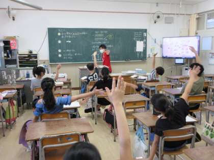 写真はみんなでダンス!!!、、、しているのではありません。両手を広げて約1mを表現しています。1m=100cmと聞くとあまり変わらない印象がありますが、指を少し開いて1cm、両腕を広げて1m。長さが全く違うのがよくわかりますね。1辺1cmの立方体が1立方メートルの中に100万個入るはずですね。