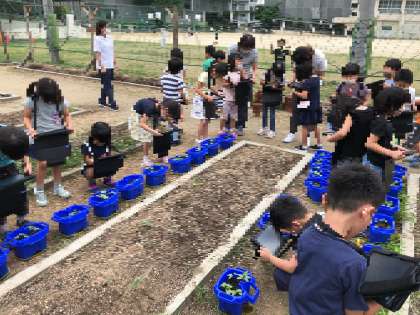 タブレットを使ってあさがおの観察をしています。