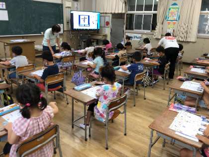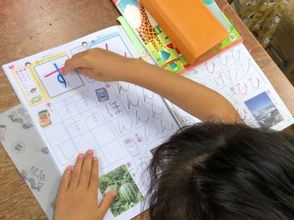 お手本の字を何度も指でなぞって、書き順や形の確認をしていました。