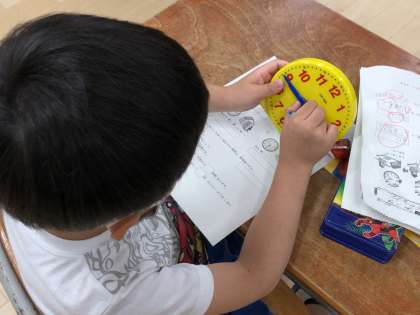 小さな時計の教材を使って練習問題に取り組んでいました。