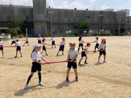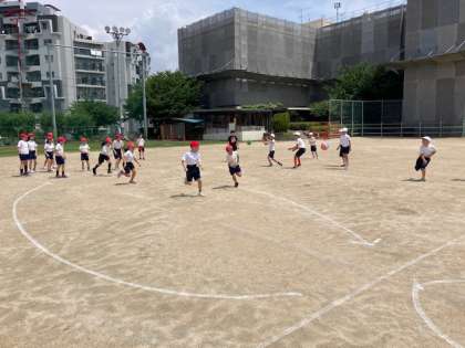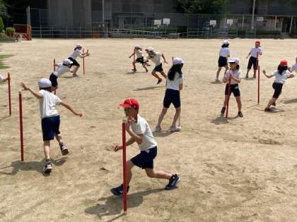 4年生は早速体育を行いました。ソーシャルディスタンスを保ちながら活動していました。