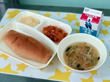今日の給食は、えびのチリソース・中華スープ・和なし(かん)・黒糖パン・牛乳です。
