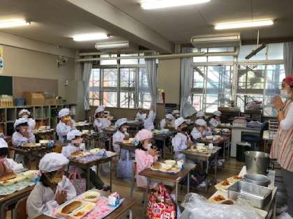 1年生は、はじめての副食3品で量が多くて少しおどろいていましたが、おいしいと言って笑顔でたくさん食べている児童が多く見られました。