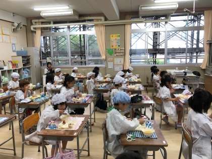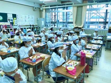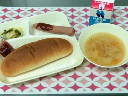 今日の給食は、ウインナーのケチャップソース・スープ・キャベツとさんどまめのサラダ・大型コッペパン・いちごジャム・牛乳です。