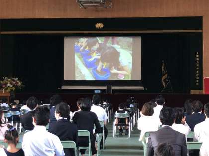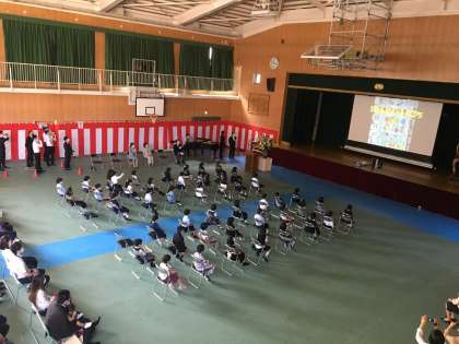 1年生の1日の様子をまとめたスライドショーを見ています。見終わった後、学級写真を撮りました。大人になったときに見返して、「あの時はコロナで大変だったなぁ」と思い出す日が来るのではないかと思います。心に残る入学式になりました。