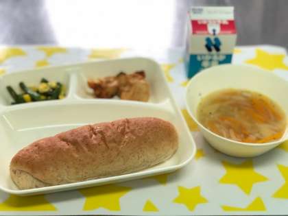 今日の給食は、けいにくのカレーマヨネーズ焼き・てぼ豆のスープ・さんどまめとコーンのサラダ・ライ麦パン・牛乳です。