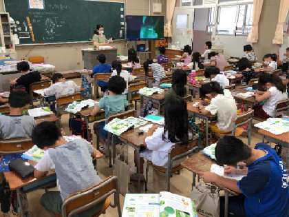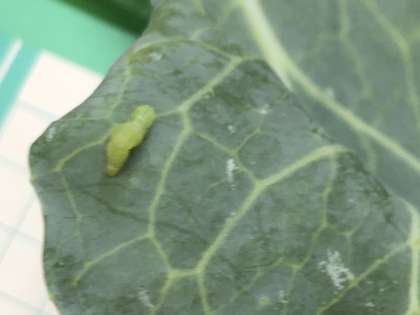 理科の学習で学習園に行って、モンシロチョウのよう虫を見つけました。