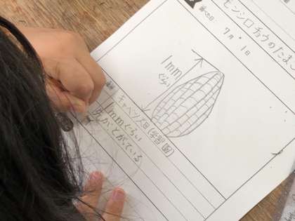 その後教室にもどって、モンシロチョウのたまご、よう虫、さなぎの観察をしました。