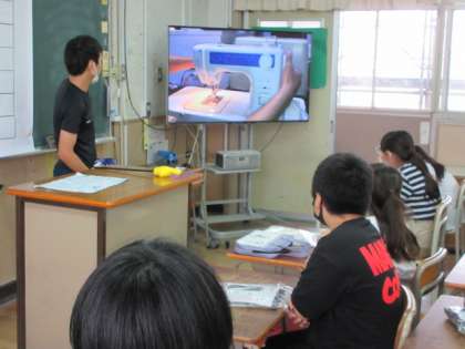6年生は今エプロン作りをしています。今日は担任の新井先生が、自宅で数時間かけて撮影、制作した本人出演「ミシンの使い方」の動画を視聴しました。手作りの動画の温かさが出ていて児童も笑顔で見ていました。