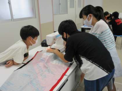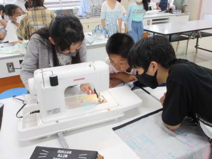 動画を見終わると家庭科室に移動し、いよいよ実習です!昨年度も使いましたが、久しぶりだったので忘れた人も。。。でもグループで協力してミシンを攻略していました!作品が出来上がり、給食の時間に使ったり、家で使ったりする日が楽しみですね!