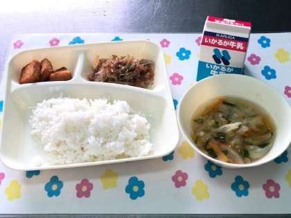 今日の給食は、ゴーヤチャンプルー・すましじる・あつあげのしょうがじょうゆかけ・ごはん・牛乳です。