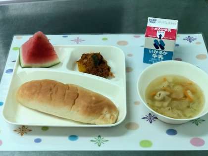今日の給食は、かぼちゃのミートグラタン・スープ・すいか・おさつパン・牛乳です。