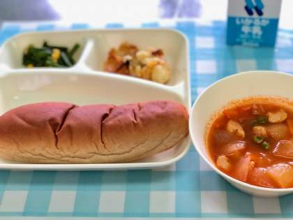 ケチャップ煮は、トマトの酸味がきいたケチャップ味でじっくりと煮込んだスープ煮には、けいにくや玉ねぎ、じゃがいも、にんじんなどが入っていました。