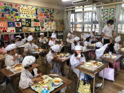 今日の給食は、ケチャップ煮・さんどまめとコーンのソテー・りんごのクラフティ・黒糖パン・牛乳です。