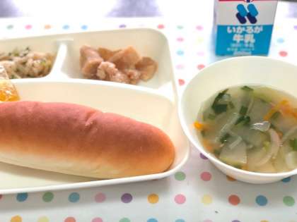 今日の給食は、けいにくのからあげ・とうがんの中華スープ・切り干し大根のごま辛味づけ・大型コッペパン・マーマレード・牛乳です。