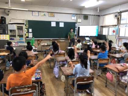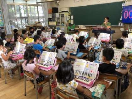 音楽科では、鍵盤ハーモニカで音を鳴らす練習をしています。鍵盤を触って、色々な音がどこにあるのか探しました。