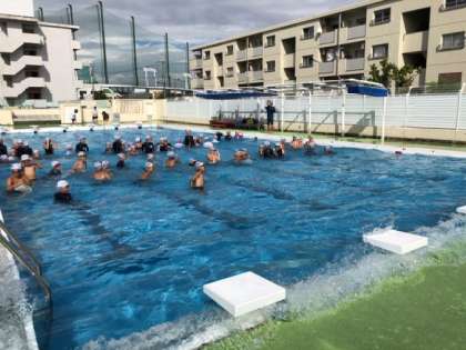 5年生全員の息がぴったり合って、プールサイドにあふれる大きな波をつくることができました。