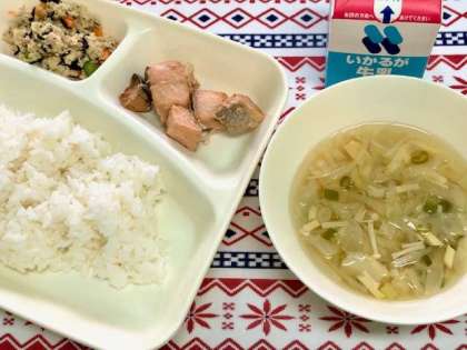 今日の給食は、さけのしょうゆふうみやき・ごもくじる・こうやどうふのいり煮・ごはん・牛乳です。