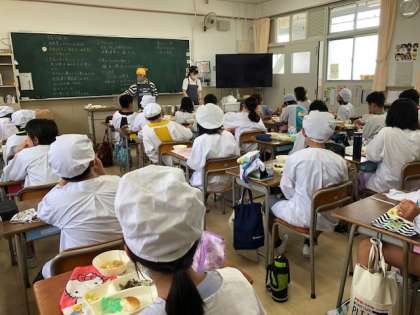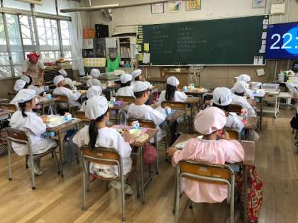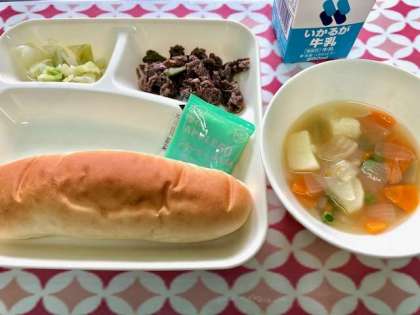 今日の給食は、牛肉のこうみやき・スープ煮・サワーキャベツ・大型コッペパン・りんごジャム・牛乳です。
