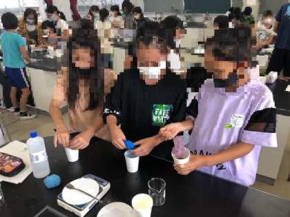 一枚目の写真は、化学クラブの様子です。洗濯のりを使ってスライムづくりに取り組みました。