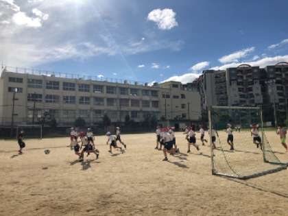三枚目の写真は、ボール運動クラブの様子です。さわやかな日差しの中で、楽しくサッカーをしています。