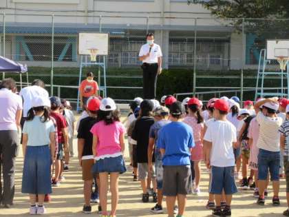 今日は運動場で児童朝会を行いました。とても久しぶりでしたが、8時25分から集合し始め、8時30分には整列が完了していました!