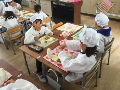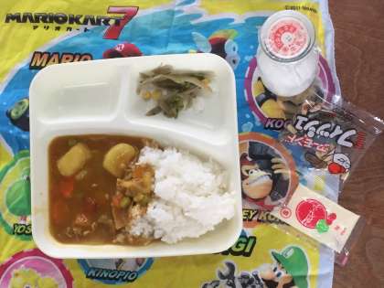 今日の給食は、みんなが大好きなポークカレーライス、ごぼうサラダ、アーモンドフィッシュです。とてもおいしそうに、たのしく食べていました。