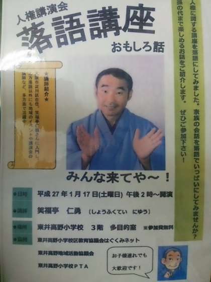 1月17日(土)東井高野小学校多目的室で、人権講演会が開かれます。