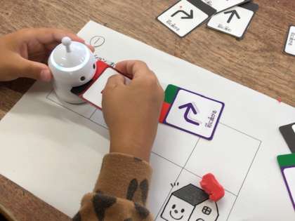 “トゥルトゥル”という小型のロボットを簡単な地図の上で指示通りに動かすプログラミングを体験しました。トゥルトゥルは動きを指示するカードを順番に読み込ませて動くプログラミングロボットです。今日は、“はじめ”“前に進む”“右に曲がる”“おわり”の指示カードを使ってトゥルトゥルを動かしました。