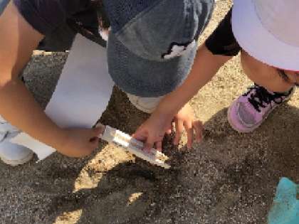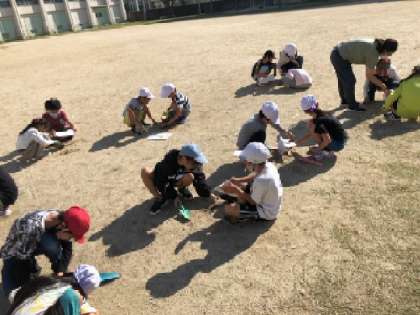 今日はグラウンドに出て、日なたと日かげの地面の温度の違いを調べました。