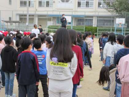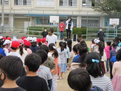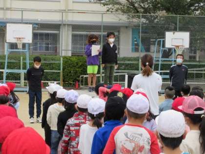 やや寒いですが気候がよいため、運動場で児童朝会がありました。