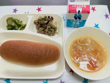 今日の給食は、牛肉のカレー風味やき・ほたて貝とトマトのスープスパゲッティ・きゅうりのピクルス・ライ麦パン・牛乳です。