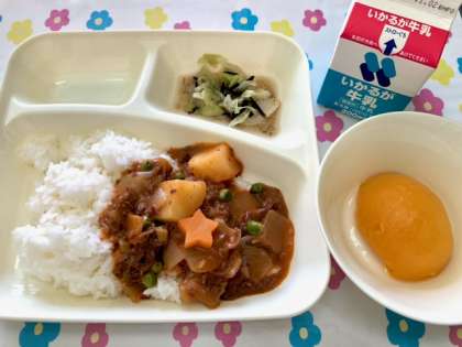 今日の給食は、ハヤシライス【こめこ】・キャベツのひじきドレッシング・黄桃(かん)・ごはん・牛乳です。