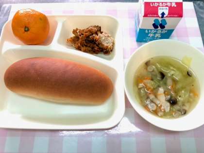 今日の給食は、なすのミートグラタン・けい肉と野菜のスープ・みかん・黒糖パン・牛乳です。
