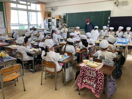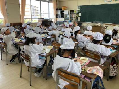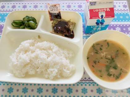 今日の給食は、お好み焼き・ぶたじる・きゅうりの梅風味・ごはん・牛乳です。