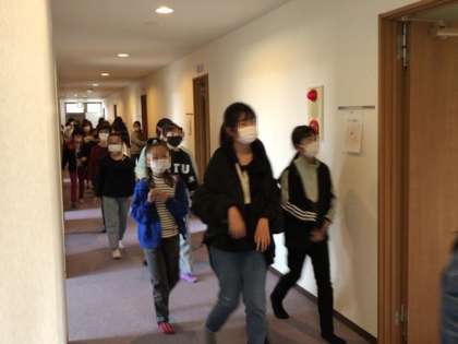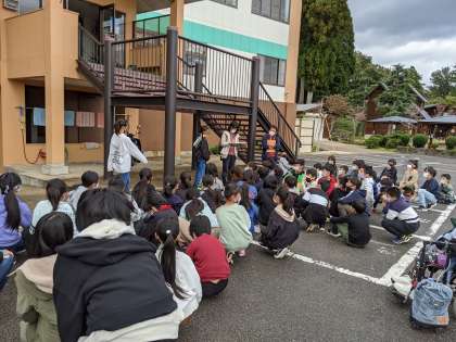 開舎式が終わり、係りの確認をしました。部屋割りの後、避難訓練を行いました。万一に備え、学校で行う避難訓練と同じように真剣に取り組みました。