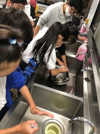 ごちそうさまの後は全員で後片付けです。ピカピカになるまで磨きます!