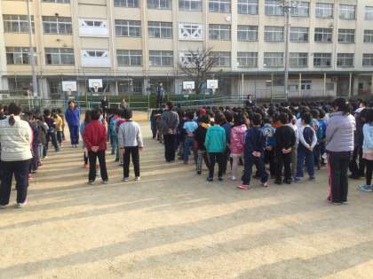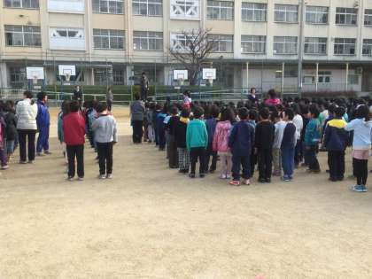 月曜日の週始めであり、いつも通り運動場での児童朝会でした。校長先生より、「失敗は成功のもと」のお話、生活指導の先生より、登校時間が遅くなっているので「登下校の時刻をまもろう。」という話、体育主任の先生より、今日からかけあし週間が始まるというお話がありました。まだまだ寒い日が続きますが、寒さに負けずに頑張っていきましょう。