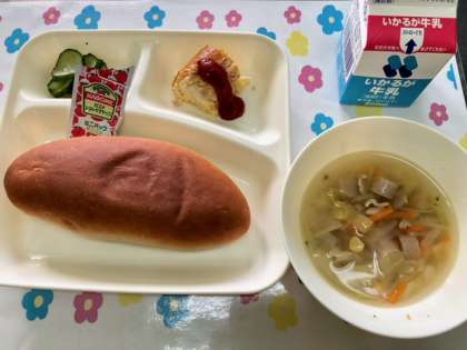 今日の給食は、ツナポテトオムレツ・スープ・きゅうりのバジル風味サラダ・黒糖パン・牛乳です。