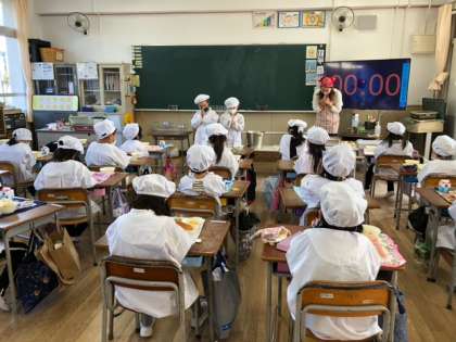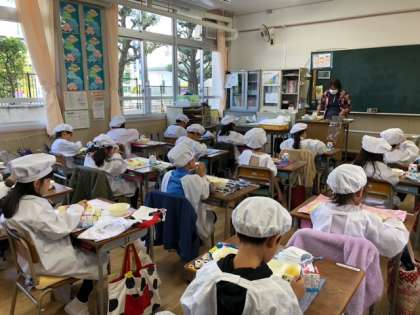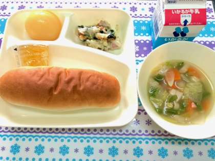 今日の給食は、スープ煮・ほうれんそうのグラタン・白桃(缶)・大型コッペパン・マーマレードジャム・牛乳です。